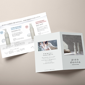 チラシ、DM、パンフレットなどの販促物デザイン。特に通販(化粧品・健康食品)や店舗販促に強みを持っています。